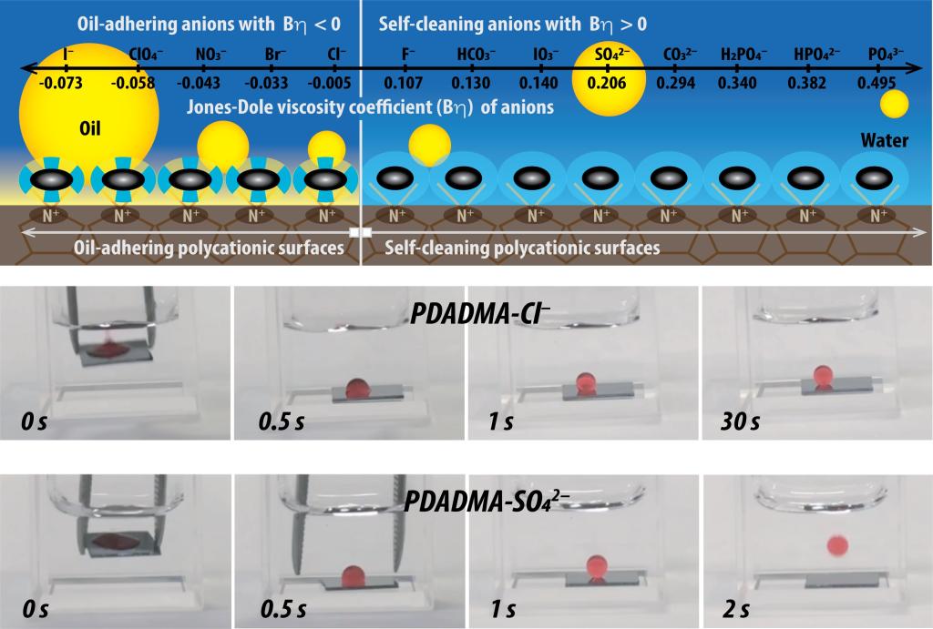 汪大洋教授课题组与其墨尔本皇家理工大学、东南大学、长春建筑大学的合作者一起基于阳离子表面水驱动的油去润湿行为,首次从实验上选择性地分析不同阴离子的水合能力的差异。基于聚二甲基二烯丙基氯化铵(PDADMA-Cl)的季铵盐重复单元的特殊的各项同性的分子构型和季铵盐独有的无水合层的特点,汪大洋教授团队设想PDADMAC阳离子模型表面的表面的亲水性主要反映其表面抗衡阴离子,氯离子(Cl-)的水合能力。借此,通过简单的表面离子交换,所制备的PDADMA-Cl的氯离子可以被一系列阴离子替换。通过分析携带不同表面抗衡阴离子的PDADMA表面水驱动的油去润湿性,表面抗衡阴离子可以很容易分成两类,一类如硫酸根离子(SO42-)可以实现水驱动的油完全去润湿性,即(水驱)自清洁,而另一类如氯离子(Cl-)在水驱动下可以牢固地吸附油滴,即(水下)油粘附。从表面技术层面上,这个实验发现提供了可能是目前最为简便的实现表面自清洁的涂层技术,它可以允许我们简易便捷地构筑各种具有自清洁功能的滤膜,比如用于油水分离。