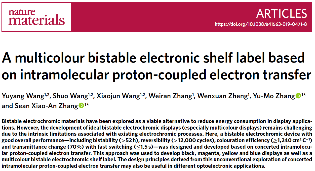张晓安教授科研团队瞄准这一重大国际需求,通过探索非传统的功能仿生方式,另辟蹊径、攻克难关,终于研发出具有优异双稳态显示性能的全新电致变色材料。2019年4月,这一科研成果发表在国际权威学术刊物《自然-通讯》上,基于该团队提出的“电致酸/碱”方法,率先展示了具有电致变色性能的功能仿生超分子材料体系,并以此成功构建了几种前景广泛的电子器件,展示了其给电刺激响应速度快、超级省电的潜能。
