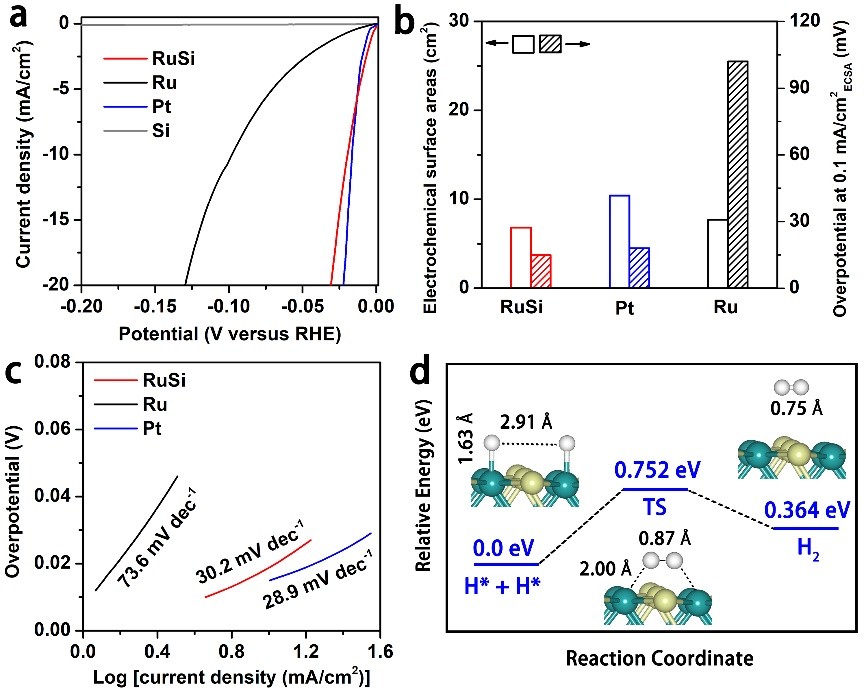 1. 发现了金属Ru的顶位位点具有类Pt的产氢催化活性;但是,相对于活性较弱、氢吸附更强的相邻Ru3空位位点,该顶位位点为隐形位点。进一步,提出了引入间隙原子Si形成金属间化合物RuSi的策略,转变Ru的顶位位点为显性位点,维持了其类Pt的催化活性。