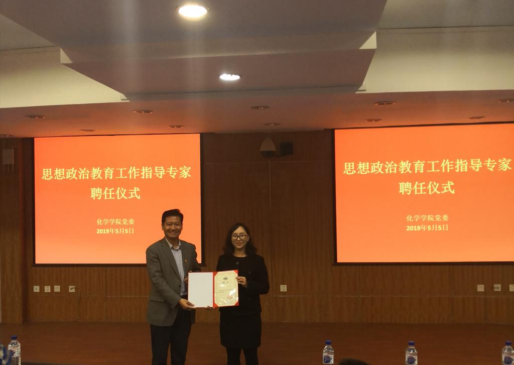思想政治教育工作指导专家石瑛教授的聘任仪式,在无机超分子报告厅举行。学院党委书记宁德宽,党委副书记、纪委书记李勇,党委副书记兼副院长江宇航,学院各教工支部书记、学生党支部书记代表,青年教师代表和学生党员代表参加此次聘任仪式。聘任仪式由学院党委副书记由胜利主持。