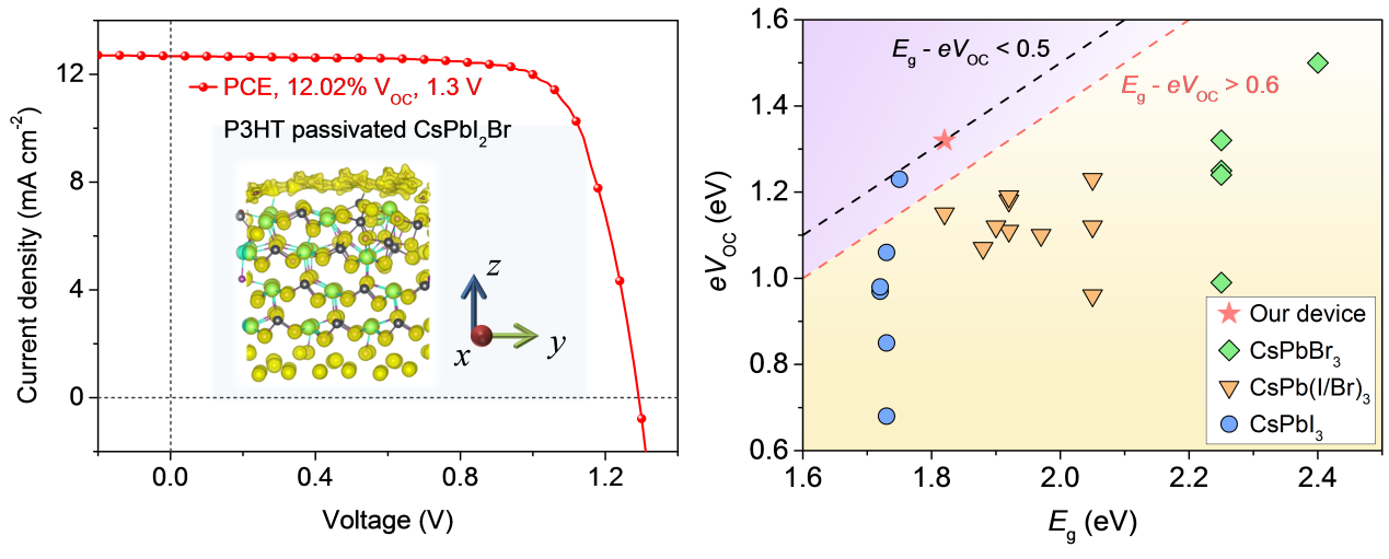 聚噻吩钝化的CsPbI2Br电池的电流密度电压曲线以及无机钙钛矿电池的eVoc与Eg关系的统计图