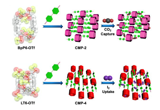 图1:基于新型芳烃大环受体的共轭大环聚合物材料用于高选择性二氧化碳捕获和碘吸附