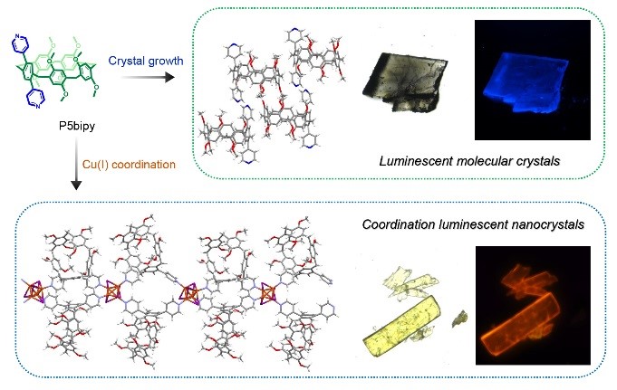 图2:由吡啶共轭柱芳烃通过晶体生长得到蓝色荧光分子晶体和通过Cu(I)配位得到红光发射配位纳米晶