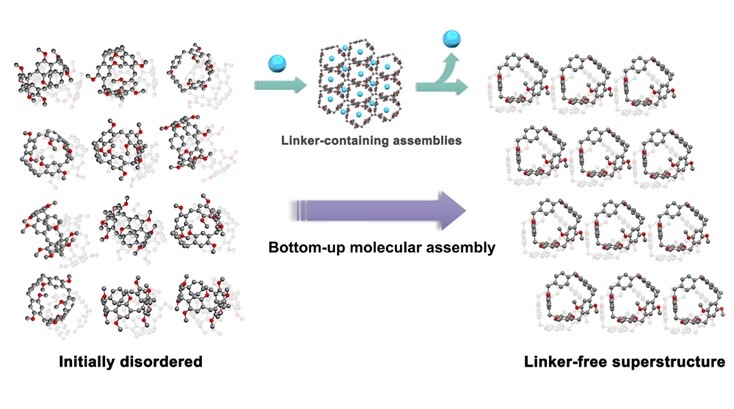 在晶体工程方面,课题组设计合成了一例“骨架精简版”甲基柱[5]芳烃衍生物,即精巧型甲基柱[5]芳烃(permethylated leggero pillar[5]arene,英文简称为MeP[5]L),并在固相条件下实现了其分子堆积从无序到有序的精准调控(图3)。实验结果表明,无定形态的MeP[5]L粉末可以通过固相主客体相互作用来吸附包括甲苯、溴丁烷在内的多种有机客体蒸气,从而构筑得到多种具有客体连接形式的有序超分子组装体中间态。有趣的是,通过加热将客体连接杆释放后,并未破坏掉原有中间态超分子组装体的有序堆积模式,因此获得了热力学稳定的无客体装载/连接形式的有序超分子组装体。通过晶体结构分析、核磁共振、粉末衍射和理论计算,证实了该固相下的分子组装过程是由客体诱导下的主体分子运动以及热驱动下的晶相转换来协同驱动而实现的,这其中分子间的动态相互作用对有序超分子组装体的形成以及分子堆积/排列模式起着决定性作用。该工作不仅对新型大环芳烃的设计合成和固相主客体化学应用开发带来一定的指导意义,且有望为新型大环芳烃分子无定形/晶态材料在能源材料、分离科学、仿生材料等领域的应用发展提供新的启示和突破口。相关成果以“Bottom-Up Solid-State Molecular Assembly via Guest-Induced Intermolecular Interactions”为题发表在美国化学会的《Journal of the American Chemical Society》期刊(J. Am. Chem. Soc.2021,DOI:10.1021/jacs.1c10139)。