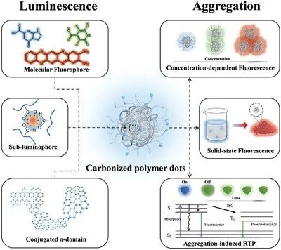 CPD通过“自下而上”的方法聚合、交联和碳化小分子、聚合物或生物质,具有碳化和交联聚合物杂化的纳米结构,同时具备碳材料和有机发光材料的特性。然而,由于复杂的反应过程和缺乏合适的表征方法,对于CPD的确切结构和发光机理仍存在许多争议。过去,人们从碳纳米材料的角度对CPD进行了更多的研究,并取得了许多进展。本综述中,作者试图从有机发光体的聚集行为,或更具体地说,碳化交联聚合物纳米粒子的角度评估CPD的发光。首先,综述了有机发光材料的聚集和发光的相关讨论,包括聚集导致猝灭(ACQ)、聚集诱导发光(AIE)和团簇触发光(CTE)。详细研究CPD内的生色团(共轭π-结构域、分子荧光团和亚发光体)以及CEE作用的重要性,指出了不同发光中心之间的相互作用,特别强调了高度交联聚合物网络的重要性。在此基础上,总结了聚集体状态下CPD的一些特殊发光行为,包括浓度依赖荧光、抗猝灭固态荧光和聚集诱导室温磷光。最后,提出了CPD未来面临的挑战和展望。本综述为从聚集体角度理解CPD的发光机制提供了一个新的视角。