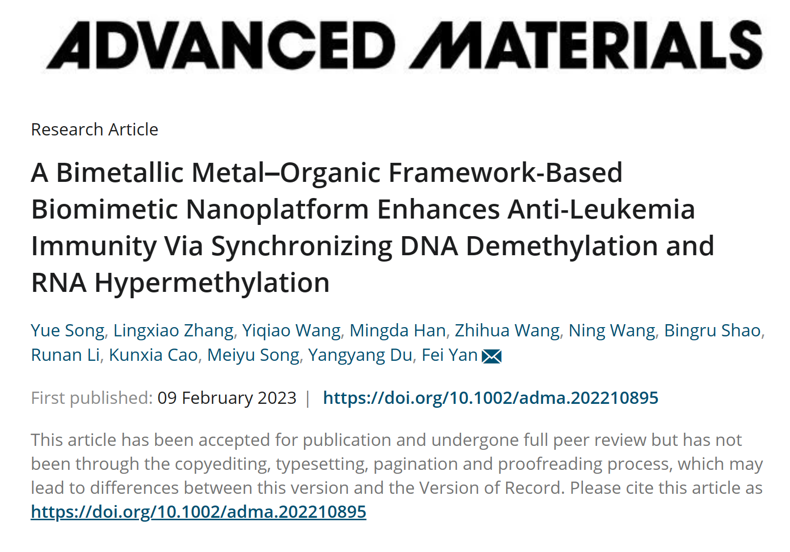 无机合成与制备化学国家重点实验室闫飞课题组提出一种纳米表观治疗新策略,并以“A Bimetallic Metal–Organic Framework-Based Biomimetic Nanoplatform Enhances Anti-Leukemia Immunity via Synchronizing DNA Demethylation and RNA Hypermethylation”为题发表在Advanced Materials上。黄色视频