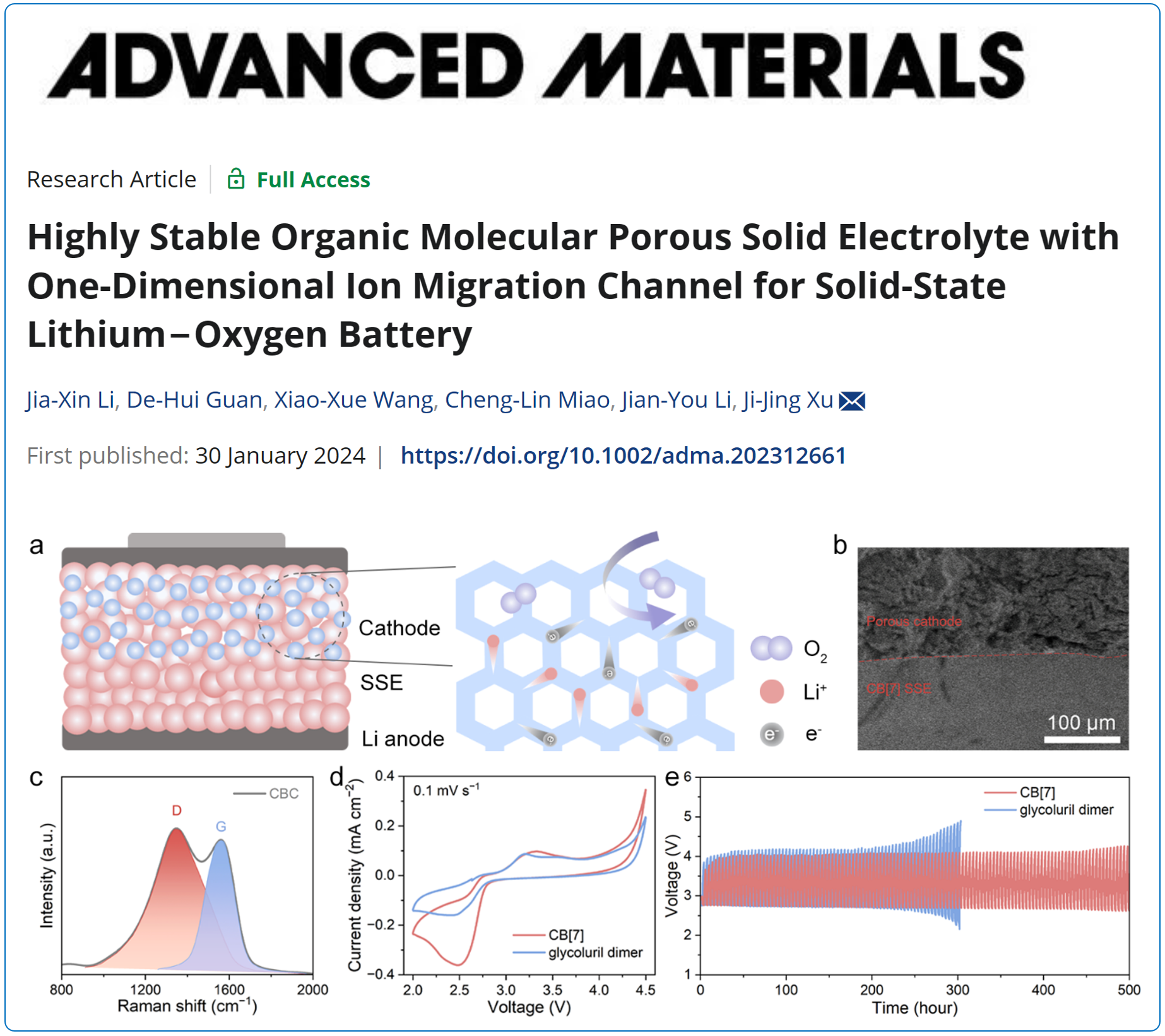 论文详情:Jia-Xin Li, De-Hui Guan, Xiao-Xue Wang, Cheng-Lin Miao, Jian-You Li, and Ji-Jing Xu*, Highly Stable Organic Molecular Porous Solid Electrolyte with One-Dimensional Ion Migration Channel for Solid-State Lithium−Oxygen Battery,Adv. Mater., 2024, 2312661.