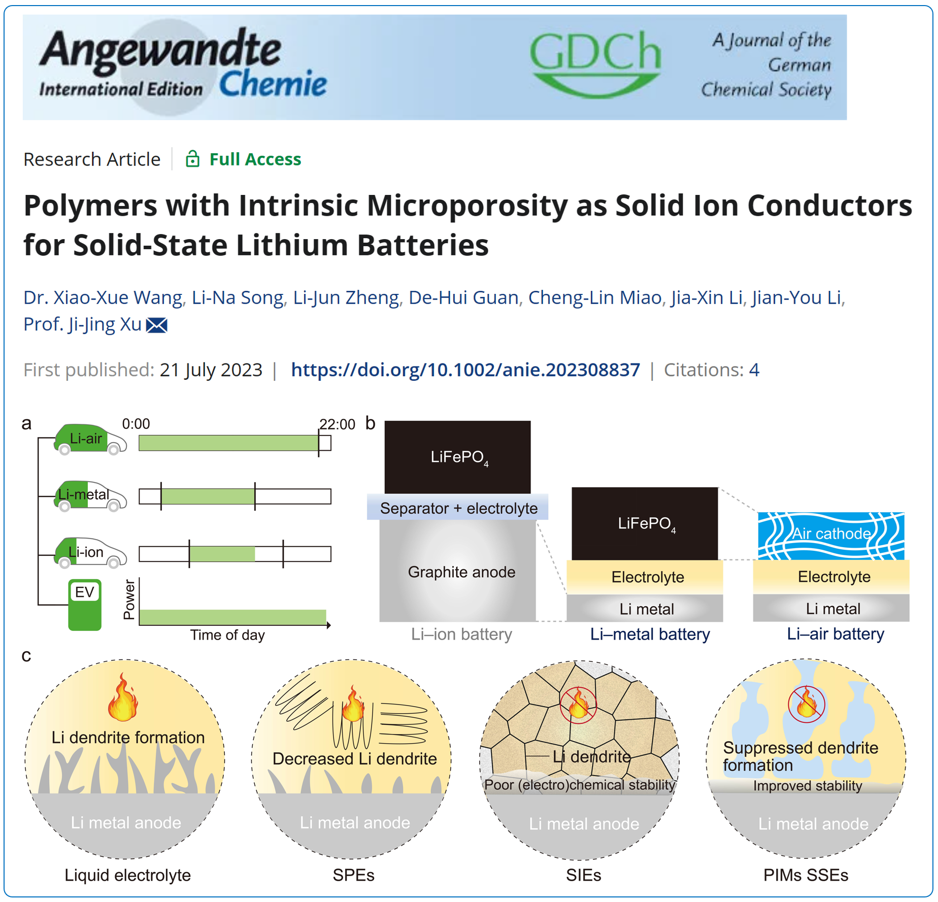 论文详情:Xiao-Xue Wang, Li-Na Song, Li-Jun Zheng, De-Hui Guan, Cheng-Lin Miao, Jia-Xin Li, Jian-You Li, and Ji-Jing Xu*, Polymers of intrinsic microporosity solid ion conductors for solid-state lithium batteries,Angew. Chem. Int. Ed., 2023, 62, e202308837.