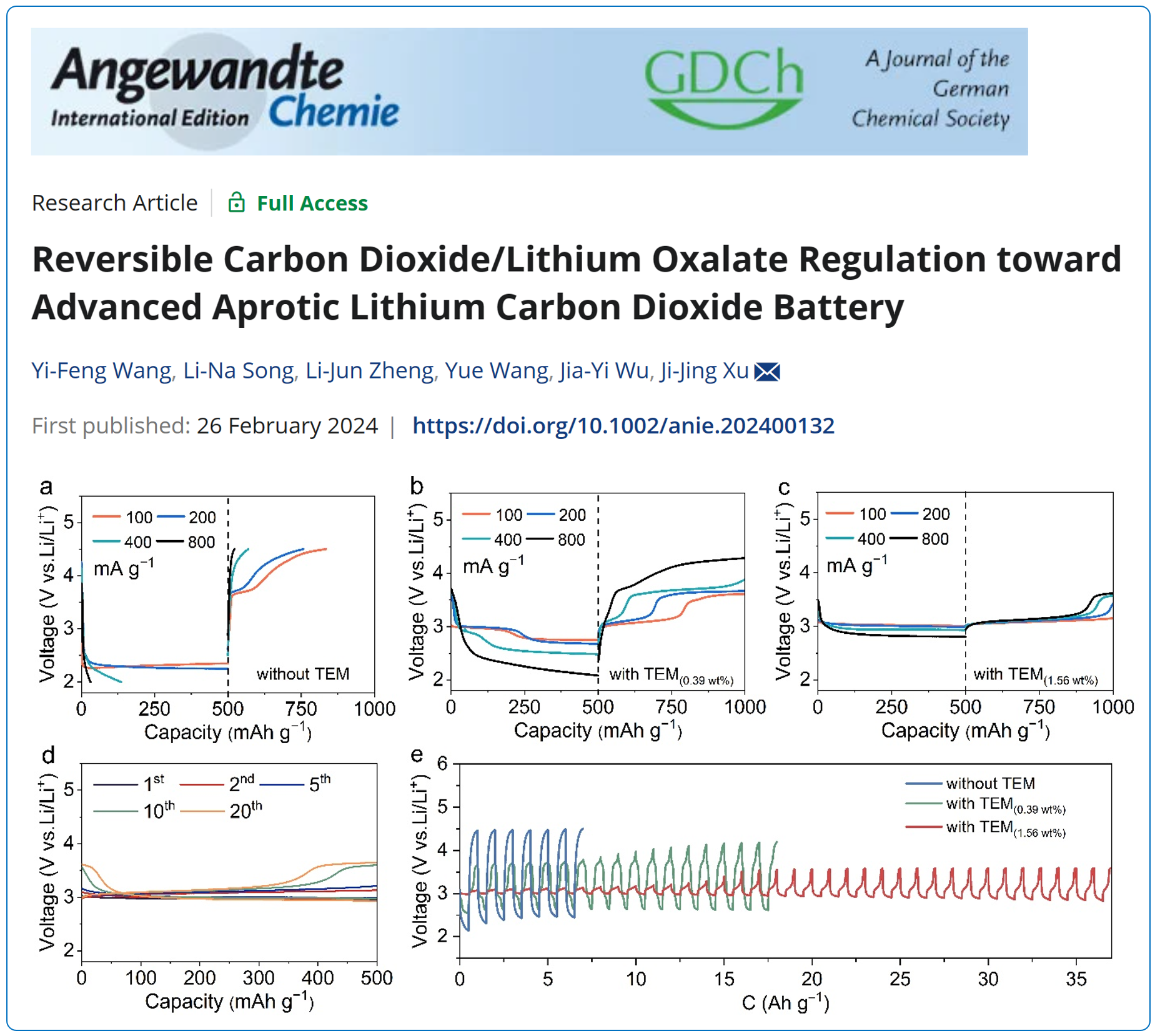 论文详情:Yi-Feng Wang, Li-Na Song, Li-Jun Zheng, Yue Wang, Jia-Yi Wu, and Ji-Jing Xu*, Reversible Carbon Dioxide/Lithium Oxalate Regulation toward Advanced Aprotic Lithium Carbon Dioxide Battery,Angew. Chem. Int. Ed., 2024,e202400132.