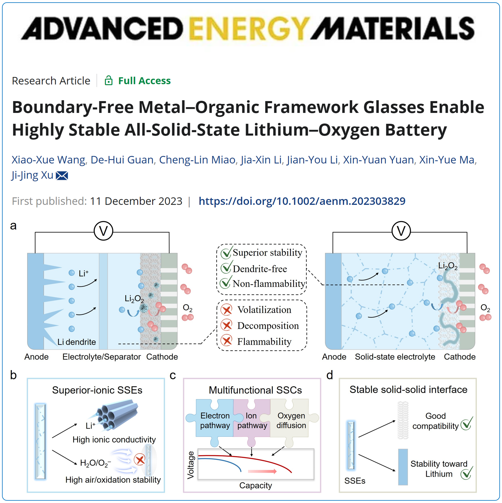 论文详情:Xiao-Xue Wang, De-Hui Guan, Cheng-Lin Miao, Jia-Xin Li, Jian-You Li, Xin-Yuan Yuan, Xin-Yue Ma, and Ji-Jing Xu*, Boundary-free Metal–Organic Framework Glasses Enable Highly Stable All-Solid-State Lithium–Oxygen Battery,Adv. Energy Mater., 2024, 14, 2303829.