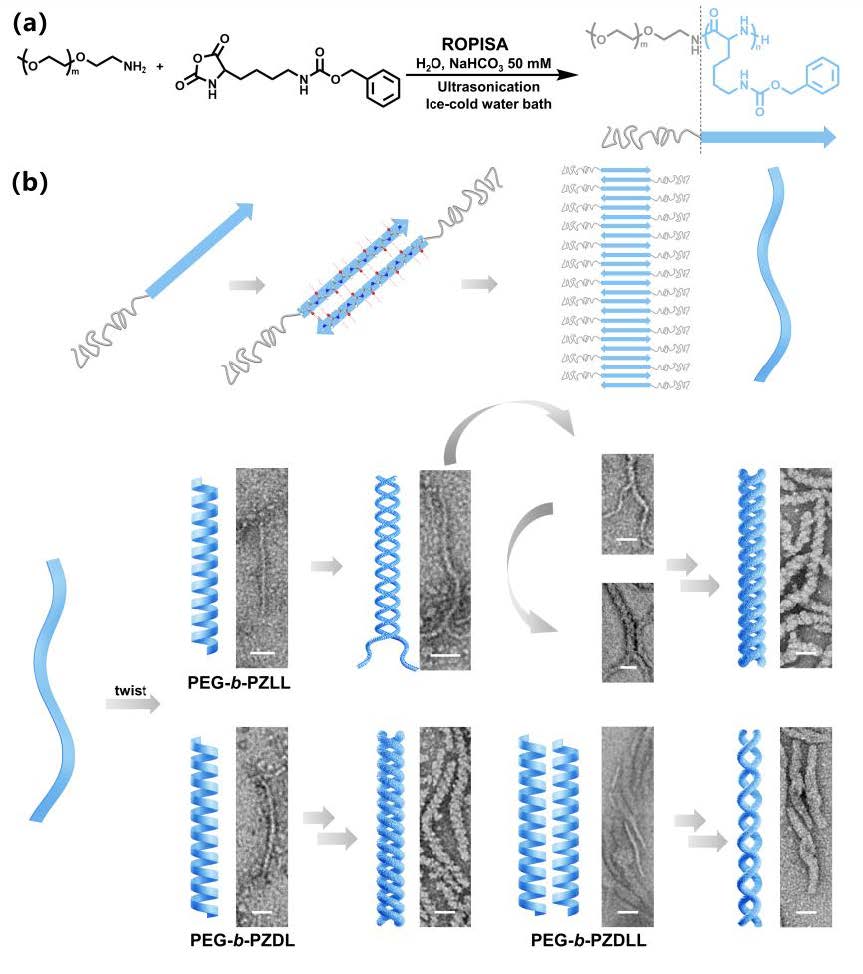 陈学思院士、孙静教授课题组借鉴天然蛋白质可自发形成高度有序多级手性超分子结构,率先提出了在超声辅助条件下,采用大分子引发剂mPEG-NH2引发ε-苄氧羰基-L/D-赖氨酸N-羧基内酸酐(ZLL-NCA/ZDL-NCA)单体在水相中开环聚合诱导自组装(ROPISA),在数分钟内高效制备了多级手性超螺旋结构,进一步诱导等摩尔外消旋单体实现立体选择性聚合,合成了具有较高立构规整度的聚肽高分子。该工作以题为“Fast Catalyst-Free Synthesis of Stereoselective Polypeptides via Hierarchical Chiral Assembly”的文章发表在Journal of the American Chemical Society 上。