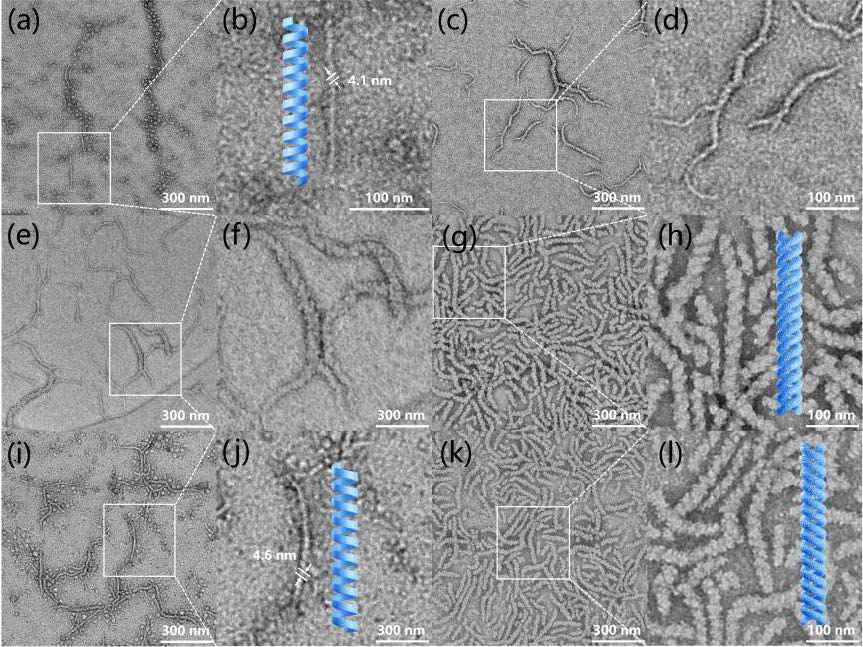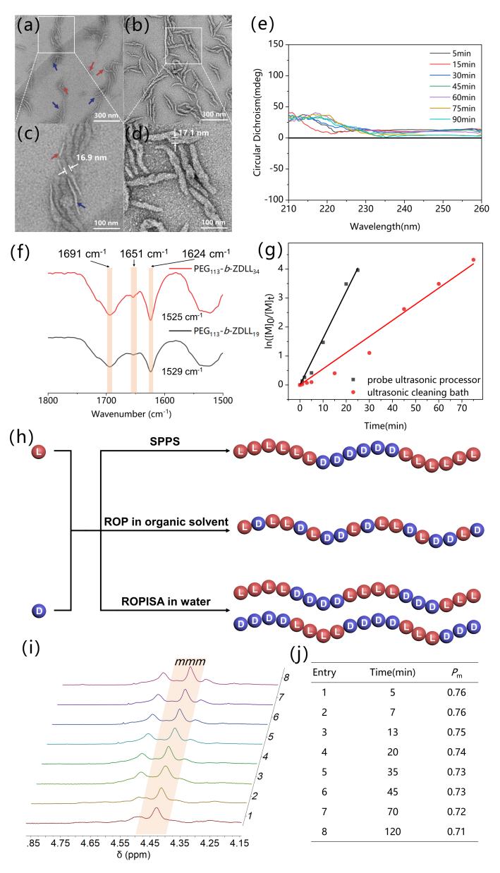 本工作中,首先在超声辅助下以mPEG-NH2 引发ZLL/ZDL-NCA 单体的开环聚合,得到了两嵌段共聚物PEG-b-PZLL/PZDL。与常规的NCA 开环聚合相比,超声辅助聚合具有更快的动力学和更高的单体转化率。通过对超分子结构形成过程的系统研究发现,PEG-b-PZLL/PZDL 的组装体首先形成较细的右手/左手螺旋结构,随聚合时间的增长,这些螺旋结构相互缠绕,最终形成超螺旋手性结构,而聚肽高分子的手性很大程度上决定了多级超螺旋结构的手性。目前的研究表明,只有在水相中才可以形成这种手性超螺旋结构。外消旋单体ZLL-NCA 和ZDL-NCA 的聚合得到的共聚物PEG113-b-PZDLLn 的TEM 结果显示,随着聚合的进行,聚合初期共存的左手和右手螺旋逐渐缠结形成交错的超螺旋结构。在不同的聚合时间得到的PEG113-b-PZDLL34 均具有较高的立构规整度,而这主要源于多级手性结构的超螺旋组装体的形成。
