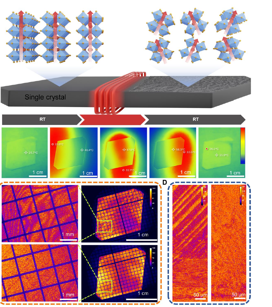 董庆锋教授课题组、浙江大学方彦俊研究员课题组提出温度梯度场内在线回火策略实现了CH3NH3PbI3(MAPbI3)钙钛矿单晶畴尺度的归一化从而制备了具有高分辨率的钙钛矿单晶伽马射线能谱探测器。大面积MAPbI3SCs回火处理后,空间均匀性显著改善,器件表现出更稳定的响应和集
