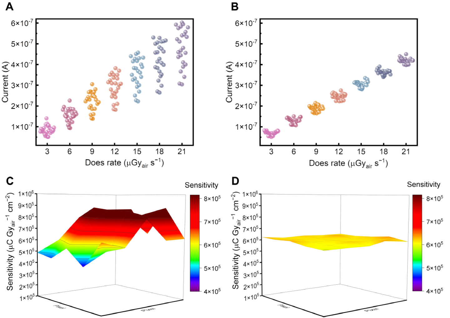 在这项工作中,经过温度梯度场回火处理,晶体相变产生的微应力原位驱动畴壁消失,实现畴尺度归一化,降低了缺陷密度,提高了载流子迁移率和离子激活能。工艺兼容量产流水线的在线In-line处理工艺。基于畴归一化的MAPbI3钙钛矿单晶构建的辐射探测器展示出了较低的暗电流,从而能够大幅度提升器件在辐照下的信噪比,获得更稳定持续的信号输出。最终,在241Am标准伽马源下获得了7.2%的能量分辨率并实现了在每个像素上具有高度均匀性能的5×5辐射探测器阵列。在25像素器件中,X射线下像素间灵敏度波动仅为8.2%,远小于未处理的单晶器件中的62.9%。通过溶液法生长钙钛矿晶体可极大降低探测级晶体的制备成本。同时,其优秀的探测性能与大面积器件的均一性对推动钙钛矿单晶射线探测器的商业化进程具有重要意义。