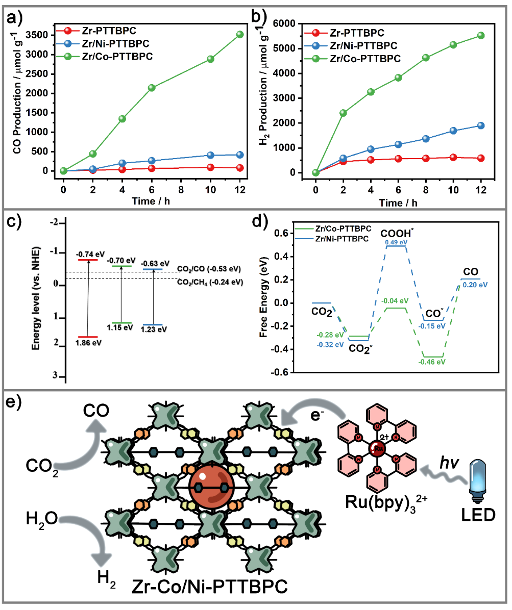 图3. Zr-PTTBPC和Zr-Co/Ni-PTTBPC的光催化活性、能级和光还原机理示意图