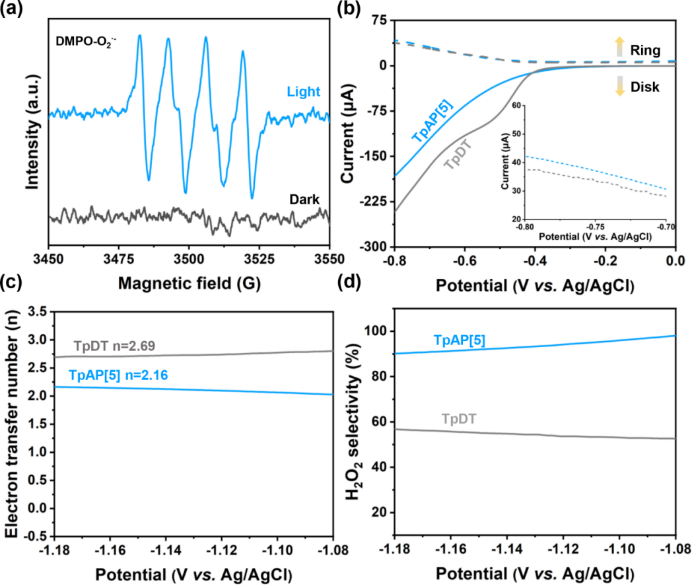 在H2O2形成机制探究部分,首先通过电子顺磁共振波谱表明,该反应中涉及两步单电子转移过程,先形成超氧自由基,然后进一步还原为H2O2。旋转环盘电极分析证实,TpAP[5]在ORR过程中表现出更接近2的电子转移数和高达90%的H2O2选择性(图3),表明柱芳烃结构的引入显著提高了反应选择性,减少了副反应发生。
