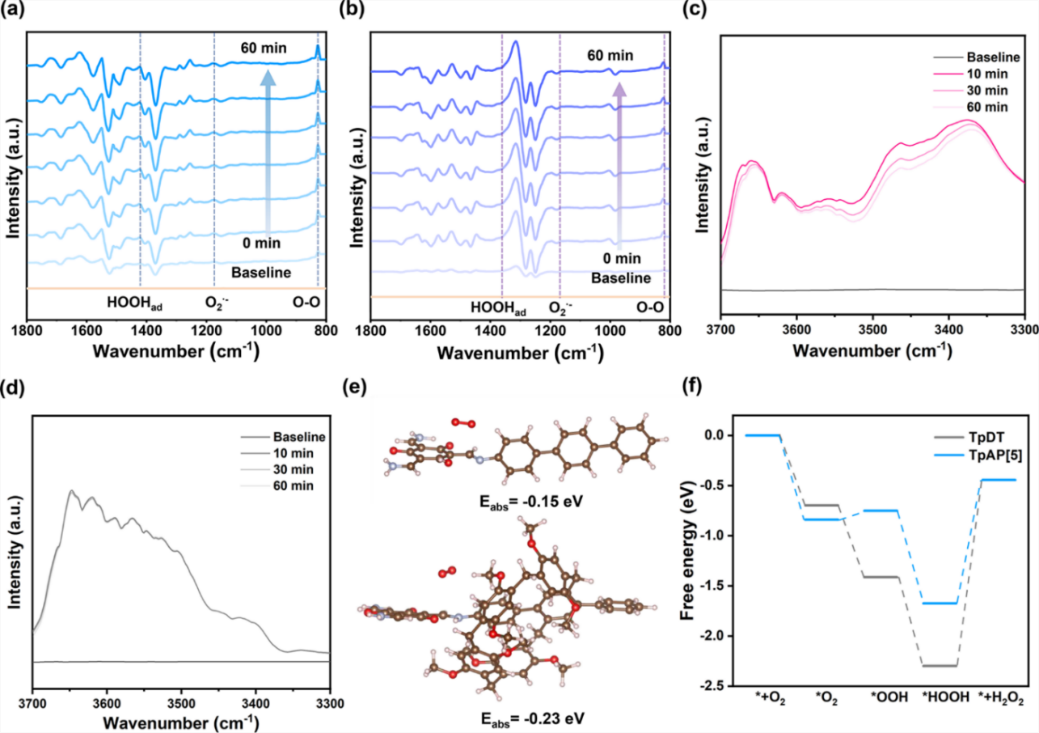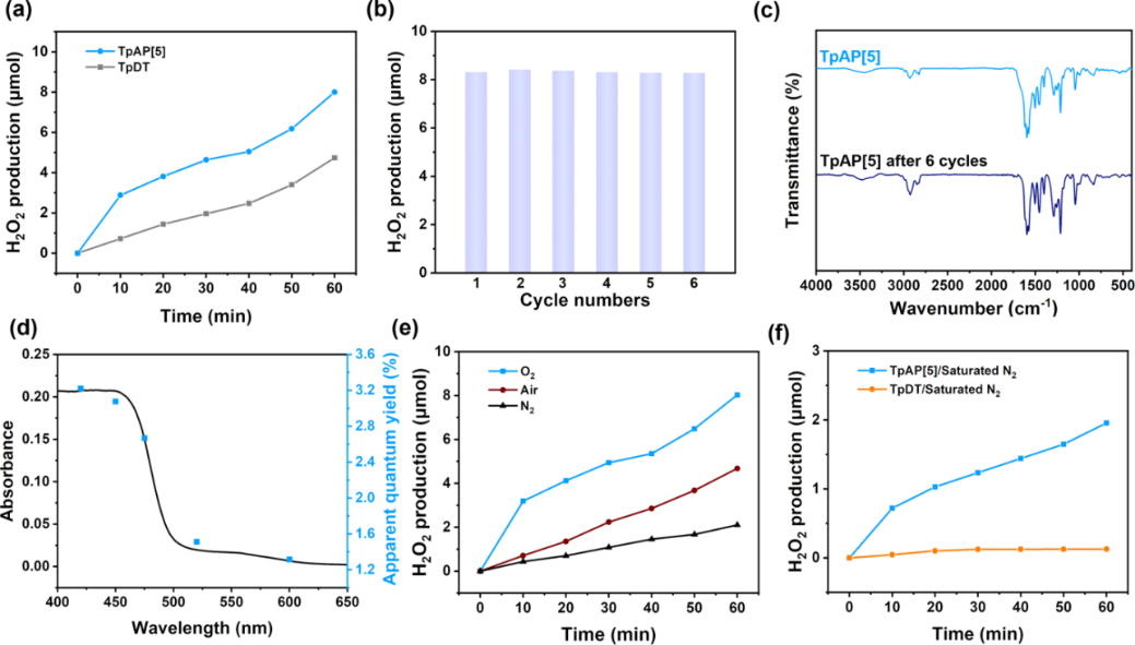 在优化条件下,TpAP[5]在1小时光催化反应中显示出2343 μmol g⁻1h⁻1的H2O2产生速率,并且在6次循环中保持稳定。在420 nm激发波长下,TpAP[5]的表观量子产率达到3.18%,且太阳能化学转化效率为0.30%,超过了植物光合作用的典型效率(0.1%),而TpDT仅为0.09%(图2)。一系列对照实验结果表明,光和O2对反应过程至关重要。在N2饱和条件下的实验证明,TpAP[5]能够通过4e⁻水氧化反应产生O2,进而作为催化反应中O2的二次来源。