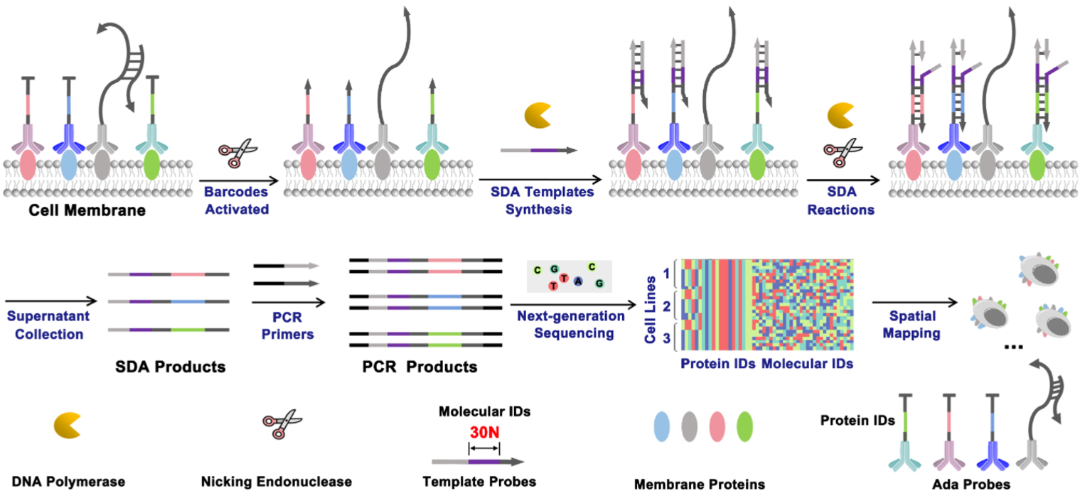 宋大千教授团队的孙颖教授与西安交通大学赵永席教授团队在复杂细胞纳米环境的蛋白质相互作用分析中取得重要进展。细胞结构的维持和功能调节在很大程度上取决于许多膜蛋白的组成和空间分布。然而,目前的方法在空间覆盖和数据可扩展性方面存在局限性,阻碍了对复杂细胞纳米环境中蛋白质相互作用的全面分析。针对上述挑战,团队提出邻近激活DNA扫描测序技术(Proximity-Activated DNA Scanning Encoded sequencing,PADSE-seq),将大规模的蛋白质邻近信息转换为DNA条码信息,实现了十种以上膜蛋白邻近位置关系的纳米尺度分析。相关成果以“Proximity-Activated DNA Scanning Encoded Sequencing for Massive Access to Membrane Proteins Nanoscale Organization” 为题,于4月11日发表于Proceedings of the National Academy of Sciences of the United States of America上。