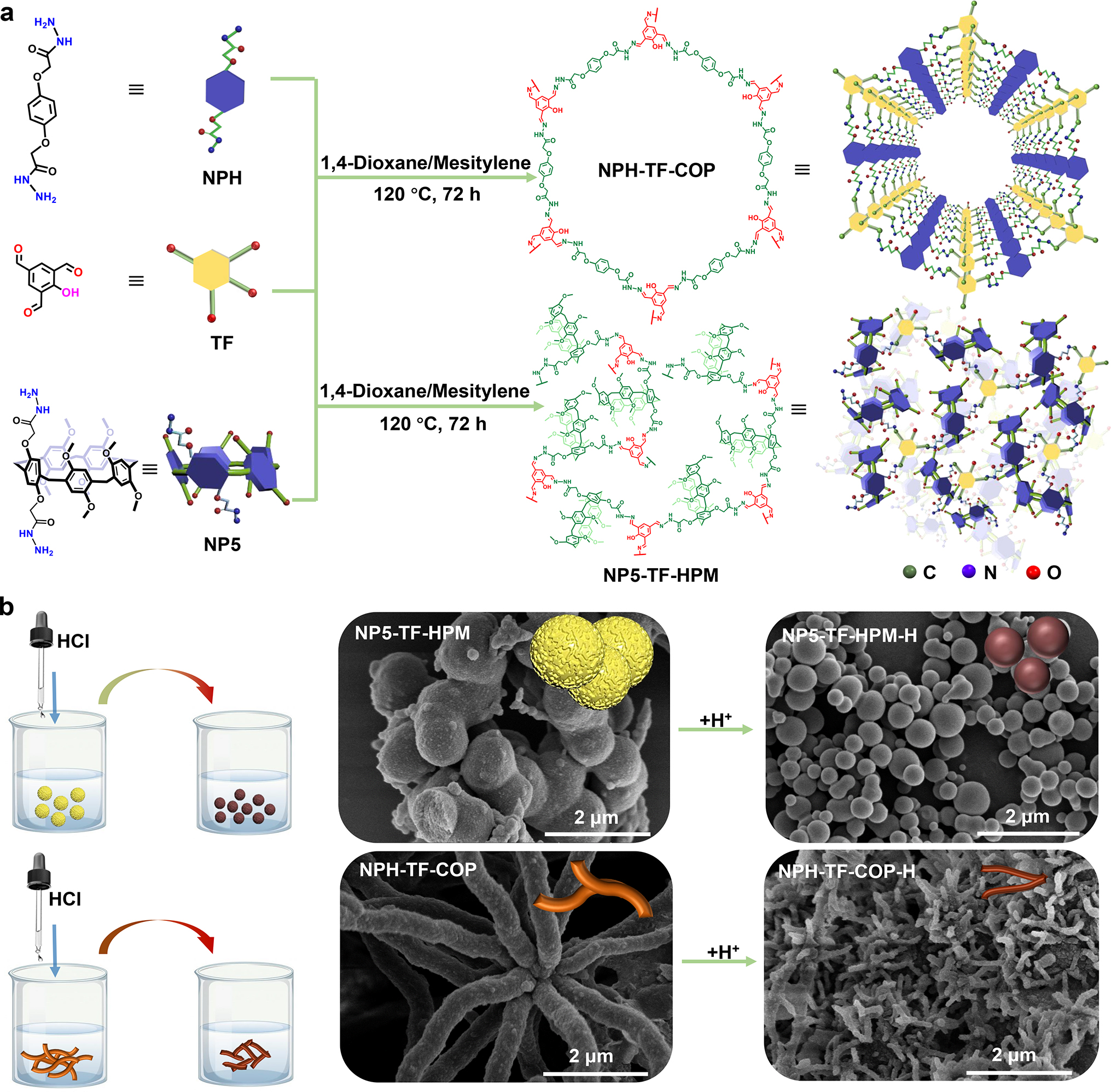 杨英威教授课题组联合张志权教授团队,在利用柱芳烃基共价有机微球进行可控高效光催化氧化方面取得重要进展。该团队巧妙地利用柱芳烃的空腔特性,提出了一种刺激响应的智能光催化剂合成策略(NP5-TF-HPM和NP5-TF-HPM-H,图1),实现了活性氧的按需扩增,从而能够精准高效地光氧化降解有毒硫化物。该项研究将分子层面的响应性转化为宏观系统应用,为复杂的光催化领域带来了进展,并有望推动超分子材料和智能材料在环境适应性技术领域的应用。相关研究成果以“Proton-Mediated ROS Amplification in Hydrazone-Linked Pillararene Microspheres for Photocatalysis”为题,于4月28日发表在Nano Letters期刊上。