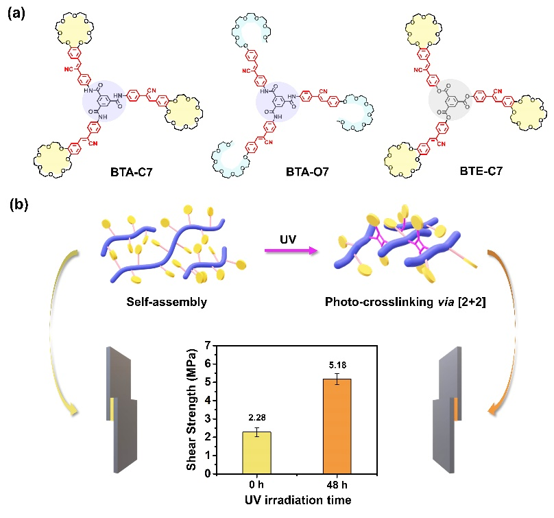 针对上述问题,姜世梅教授团队报道了一种新型三臂多功能分子BTA-C7,旨在利用超分子与共价聚合的协同策略实现卓越的黏附性能。BTA-C7具有中心的苯-1,3,5-三甲酰胺(BTA)核心,其上延伸出氰基二苯乙烯基团,每个基团末端均连接一个苯并冠醚大环。在常温常压下,BTA-C7通过分子间氢键、π-π和范德华力的协同作用自组装形成超分子网络,并展现出2.28 MPa的基准黏附强度。值得注意的是,依托高度有序的超分子网络提供的限域效应,在紫外光照射下,氰基二苯乙烯基团可通过[2+2]环加成反应发生共价光交联,此过程显著增强了体系的黏附强度(30 kg·cm⁻²承载能力,5.18 MPa剪切强度)。与模型化合物BTE-C7(酰胺单元被酯基取代)和BTA-O7(冠醚基团被二醇链取代)的对比研究揭示,酰胺与冠醚单元对于超分子网络的形成和共价交联的实现均不可或缺。