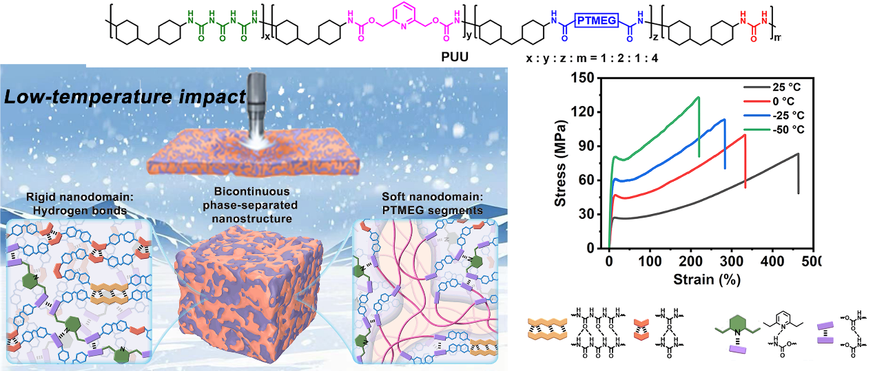 孙俊奇教授课题组通过可逆交联策略,利用不同结合能的氢键及其聚集体交联柔性聚四氢呋喃(PTMEG)链段,成功制备了一种在极低温度下具有卓越抗冲击性能和柔韧性的高强度聚氨酯-脲(PUU)塑料。PUU塑料通过尿素、2,6-吡啶二甲醇、羟基封端的PTMEG、水(H₂O)与二环己基甲烷-4,4'-二异氰酸酯(HMDI)之间的缩合聚合反应合成。PUU中含有三缩脲、脲基、氨基甲酸酯、吡啶等基团,它们能够形成单重、二重或四重氢键(图1)。这些氢键聚集形成纳米硬相区,而柔性的PTMEG链段则形成软相区,两者相互贯穿,构成稳定的互穿网络。PUU塑料中引入的氢键作用力具有多样的解离与重构时间尺度,结合能分布宽广。这种分布特性使材料在面临不同冲击频率及极端低温条件时,能够激活不同类型的氢键参与能量耗散,从而显著提升其低温抗冲击性能。此外,纳米硬相的引入增加了PUU塑料中的自由体积,有效抑制了PTMEG链段在低温下的结晶行为,从而赋予链段较高的运动性,提升了材料在低温环境下的柔韧性。在硬相和软相的协同作用下,PUU塑料表现出卓越的强度、低温柔韧性和抗冲击能力。在 −50 °C条件下,PUU塑料的屈服强度、断裂强度、杨氏模量和断裂应变分别达到81.1 MPa、133.0 MPa、1.5 GPa和220.9%,其综合力学性能可与常温下高韧性塑料的同类指标相媲美。更为突出的是,在−50 °C下,厚度为0.3 mm的PUU塑料的最大冲击抵抗力(MIRF)和冲击能量分别高达667.8 N和3.8 J,显著优于常用商用抗冲击塑料在室温下的表现。此外,该材料在−196 °C下暴露12小时后仍保持良好的柔韧性,展现出优异的极端低温适应能力。在对比实验中,作者以丁二醇(BDO)替代水,与尿素、2,6-吡啶二甲醇、羟基封端的PTMEG及HMDI反应,合成了不含脲基氢键但同样具有双连续相结构的PUU-BDO塑料。该塑料在−50 °C冲击条件下发生脆性断裂。对比结果表明,具有宽结合能分布的氢键交联位点对于塑料在低温环境下保持超高强度、韧性及抗冲击性能起到关键作用。