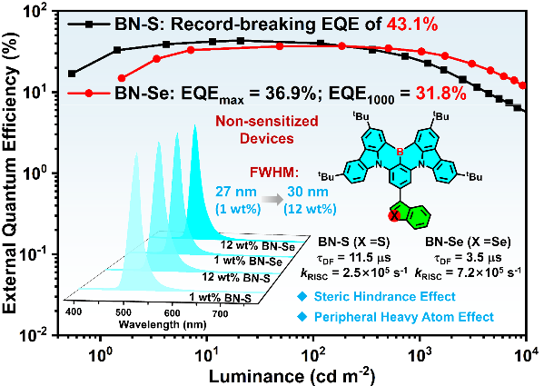 引入具有较大原子半径的硫、硒等重原子可以通过增强SOC,显著提升RISC速率,从而提高三线态激子利用率。然而,将重原子直接嵌入多重共振骨架中有可能会增加基态与激发态结构弛豫,削弱材料窄谱带发射的特性。针对这一问题,路萍教授团队和英国圣安德鲁斯大学Eli Zysman-Colman教授团队合作,采用外围重原子修饰的策略,通过在经典的MR-TADF骨架BCzBN的硼对位引入苯并噻吩和苯并硒吩基团,合成了MR-TADF分子BN-S和BN-Se,实现了快速的反向系间窜越过程,并成功应用于高效率、低滚降的有机发光二极管中。