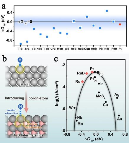 图:a) TMB表面氢吸附能和ΔGH*; b) B引起的H表面吸附性质变化示意; c) HER反应ΔGH*和火山型关系曲线