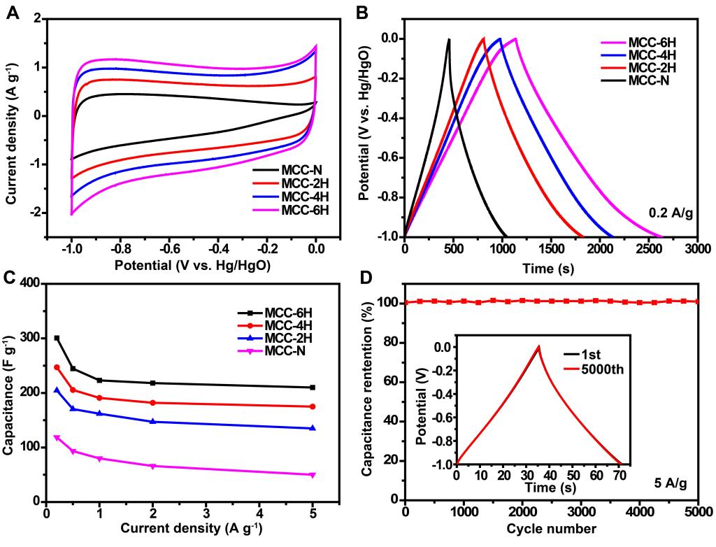 通过超级电容器性能测试我们发现,MCC-6H的性能最佳,这得益于充分贯通的多腔室的分级结构。MCC-6H比电容在0.2 A/g电流下达到301 F/g,是一种很有潜力的超级电容器材料。