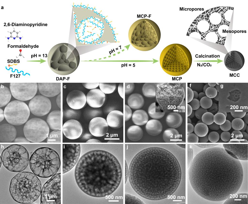 乔振安教授课题组提出了一种表面活性剂诱导的限域聚合策略来合成具有精细结构的氮掺杂多腔室碳微球(MCC)。这种碳球的前驱体是一种基于2,6-二氨基吡啶(DAP)的新型多腔室聚合物(MCP)。如图1所示,一锅法合成MCP包含了两个聚合步骤。第一步在碱性溶液中DAP与甲醛生长成类细胞骨架结构的预聚物DAP-F。在聚合过程中聚合物表面活性剂F127和阴离子表面活性剂十二烷基苯磺酸钠形成双表面活性剂体系来控制DAP-F预聚物的生长。其中,F127用作空间稳定剂来防止DAP-F颗粒团聚。DAP分子中的氨基集团可以降低阴离子表面活性剂负电基团的静电排斥,导致表面活性剂排列成囊泡来减少端基基团的裸露面积,从而导致DAP-F中大空腔的形成。加入乙酸后开始第二阶段的聚合,随着溶液pH的降低,DAP-F预聚物发生进一步交联,其在微球限域空间中的聚合导致大腔室空间分隔形成丰富的小腔室。