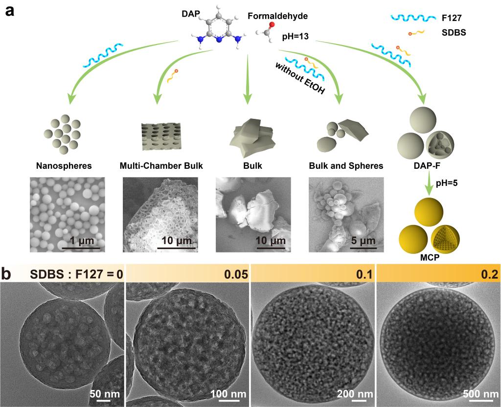 图3 a.不同合成条件对DAP-F形貌的影响;b. 不同比例的SDBS/F127对MCP尺寸与内部结构的影响。