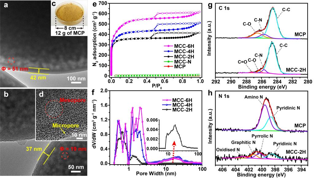 图2 a. MCP TEM图;b. MCC TEM图;c. 12 g MCP粉末的光学照片;d. MCC HRTEM图;e. MCC-xH在77 K温度下的氮气吸附等温线;f. MCC-xH的DFT孔分布;g. MCP与MCC-2H 的C XPS;MCP与MCC-2H 的N XPS。
