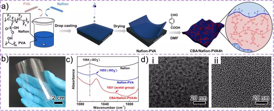 超分子结构与材料国家重点实验室的孙俊奇课题组将Nafion和聚乙烯醇(PVA)形成的氢键复合物膜通过后浸泡的方式修饰上对醛基苯甲酸(CBA)分子,从而制备了可修复机械损伤并恢复自身原有质子传导率、甲醇阻隔能力及电池性能的本征型自修复质子交换膜。