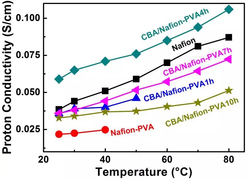 研究表明,自修复质子交换膜中的PVA组分可以通过氢键相互作用交联Nafion中的磺酸基团从而形成比传统的Nafion膜更小更密集的质子传输通道。同时,该膜内羟基和磺酸基团之间形成的氢键网络以及膜的高含水量也为质子传输提供了连续的路径。因此,该自修复质子交换膜在80 °C的水中展现出较高的质子传导率(0.11 S/cm),这一数值比传统的Nafion膜高出20%。
