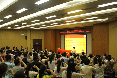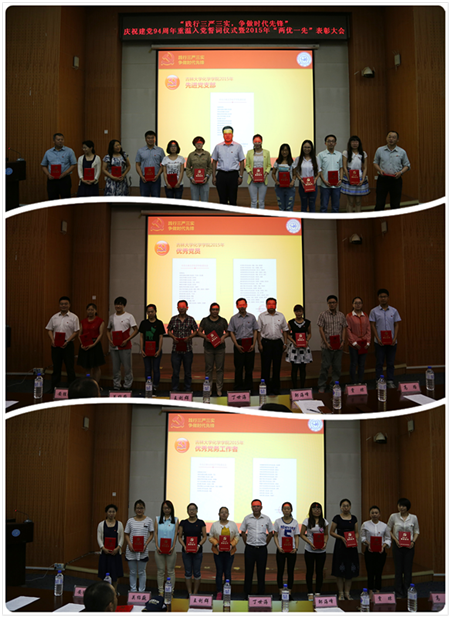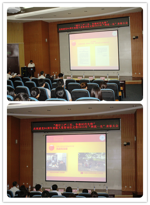 党委在无机超分子楼二楼圆形报告厅举行了庆祝建党94周年重温入党誓词仪式暨2015年“两优一先”表彰大会。副处级以上党员领导干部、教工党员、学生党员代表等200余人参加了大会,会议由学院党委副书记李勇同志主持。
