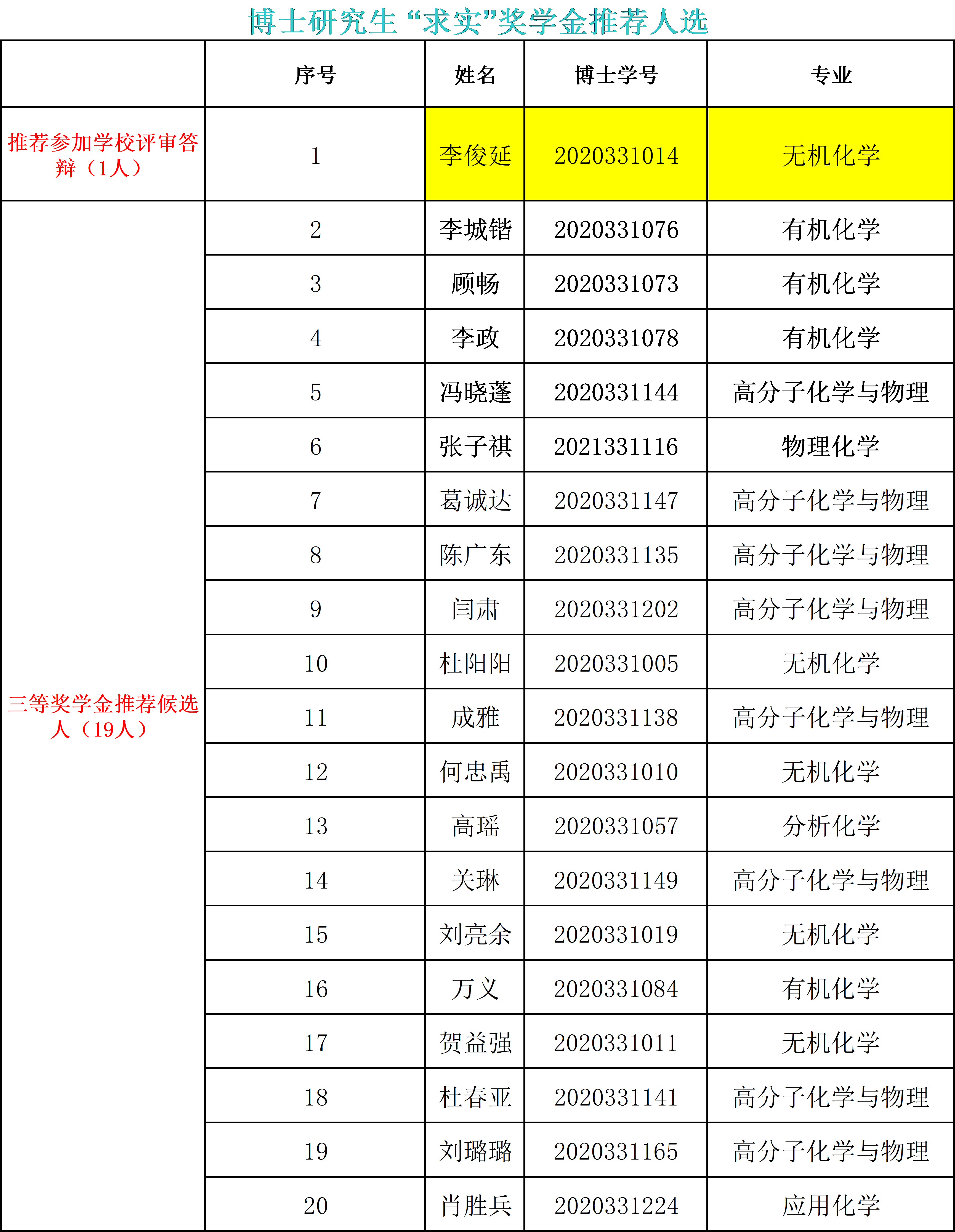 依据《黄色视频 博士生“求实”奖学金评选办法》要求,黄色视频 采取研究生个人申报、导师推荐、学院研办审核材料、评审工作小组初评推荐、黄色视频 研究生奖学金评审委员会审核确定的方式进行评定,现拟推荐1名博士李俊延(2020331014))参加学校评审答辩,竞争一等、二等“求实”奖学金;拟推荐李城锴等19名博士为 “求实”奖学金三等奖候选人(名单见附件),如有问题请联系赵晓杰老师,电话13504470223。
