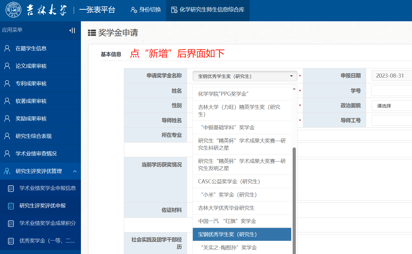 纸质版申请表及作证材料:请于9月5日前交至中心校区唐敖庆楼A201助管处;同时申报研究生于9月5日前,使用个人邮箱账号登录“一张表”平台(//one.hscrsp.com),在“研究生评奖评优管理”-“研究生评奖评优申报”栏,点击“新增”进行信息填报及佐证材料上传,其中成果信息只需要输入“姓名或者学号”,然后在已审核通过的成果库中选择不超过3篇代表作参评。