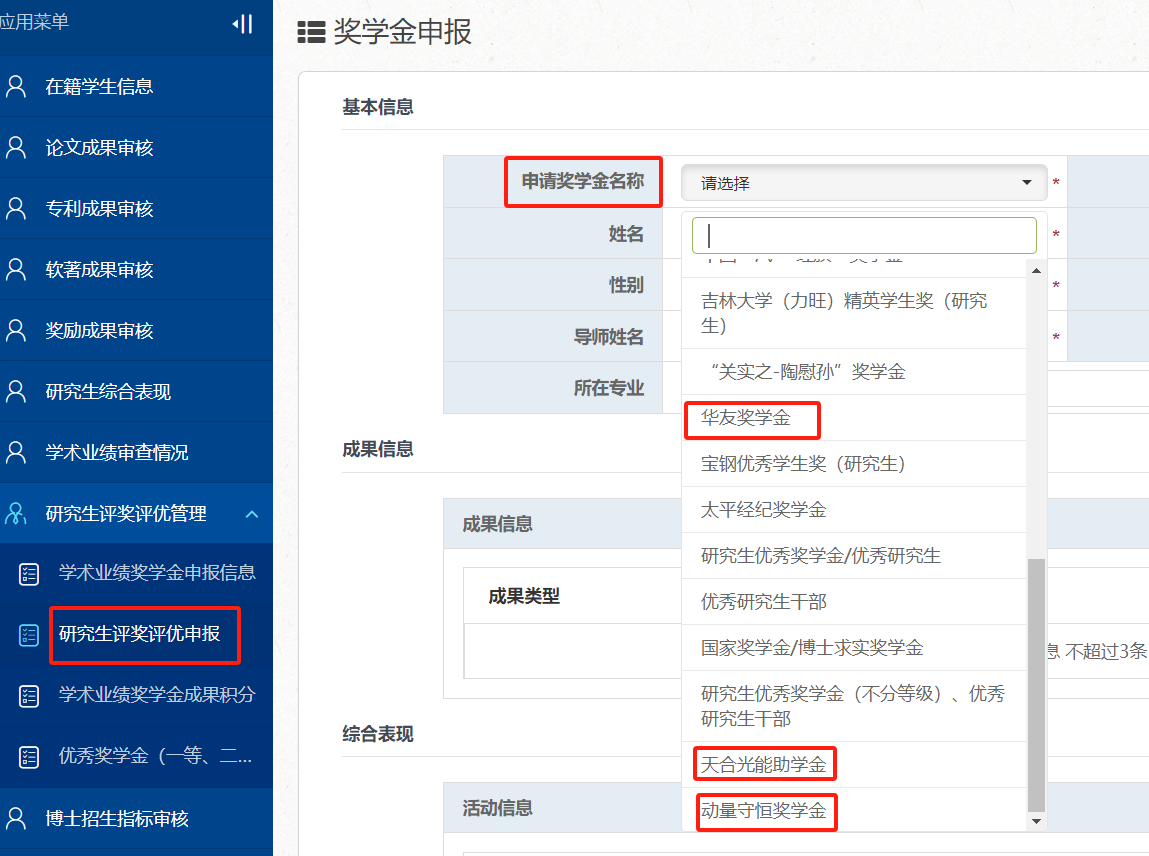 (1)申报人于11月30日12:00前使用个人邮箱账号登录“一张表”平台(//one.hscrsp.com),在“研究生评奖评优管理”-“研究生评奖评优申报”栏,点击【新增】进行【华友奖学金】信息填报,同时扫码加入申报微信群。