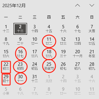 表中的“次序”是指上课顺序,即:12月11日是第一次课,12月16日是第二次课,12月18日是第三次课,以此类推。也可参考下列日历图片,红圈代表下午5、6节上课,红方块代表上午3、4节上课:
