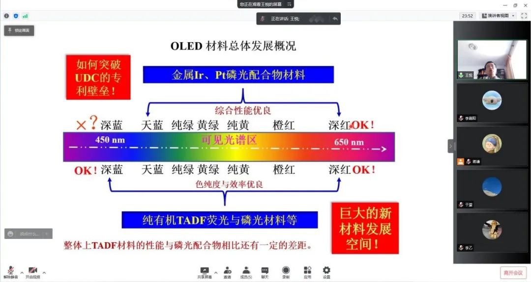 王悦教授从OLED显示屏的广泛市场应用出发,提出了在万物互联的5G时代,具有超薄、轻柔、便携、画质优良、超快动态显示、环境与场景兼容、半透明、低能耗性质的OLED显示屏将是最满足未来市场需要的科技产品。而通过大量尝试和筛选,发现一些发光稳定、性能优良的OLED发光材料是制备这一类产品的基础。接着,王悦教授为同学们介绍了OLED发光材料的发光原理、常见类型、1987年以来的研究进展、以及限制其应用的关键瓶颈。