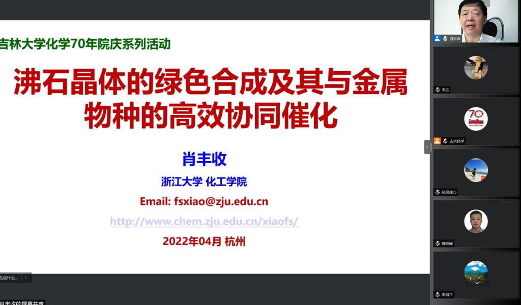 4月24日上午,浙江大学求是特聘教授、国家杰出青年科学基金获得者肖丰收应邀线上做客“吉大化学七十年——科学与未来系列讲座”,以“沸石晶体的绿色合成及其与金属物种的高效协同催化”为题,为学院师生作学术报告。