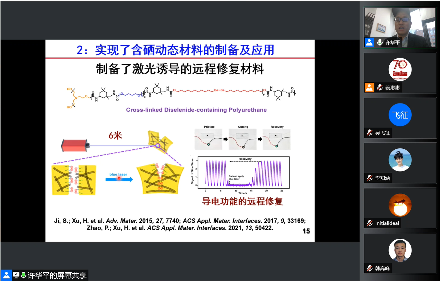 5月8日上午,清华大学化学系教授、国家杰出青年科学基金获得者许华平应邀线上做客“吉大化学七十年——科学与未来系列讲座”,以“动态响应性含硒/碲高分子”为题,为学院师生作学术报告。