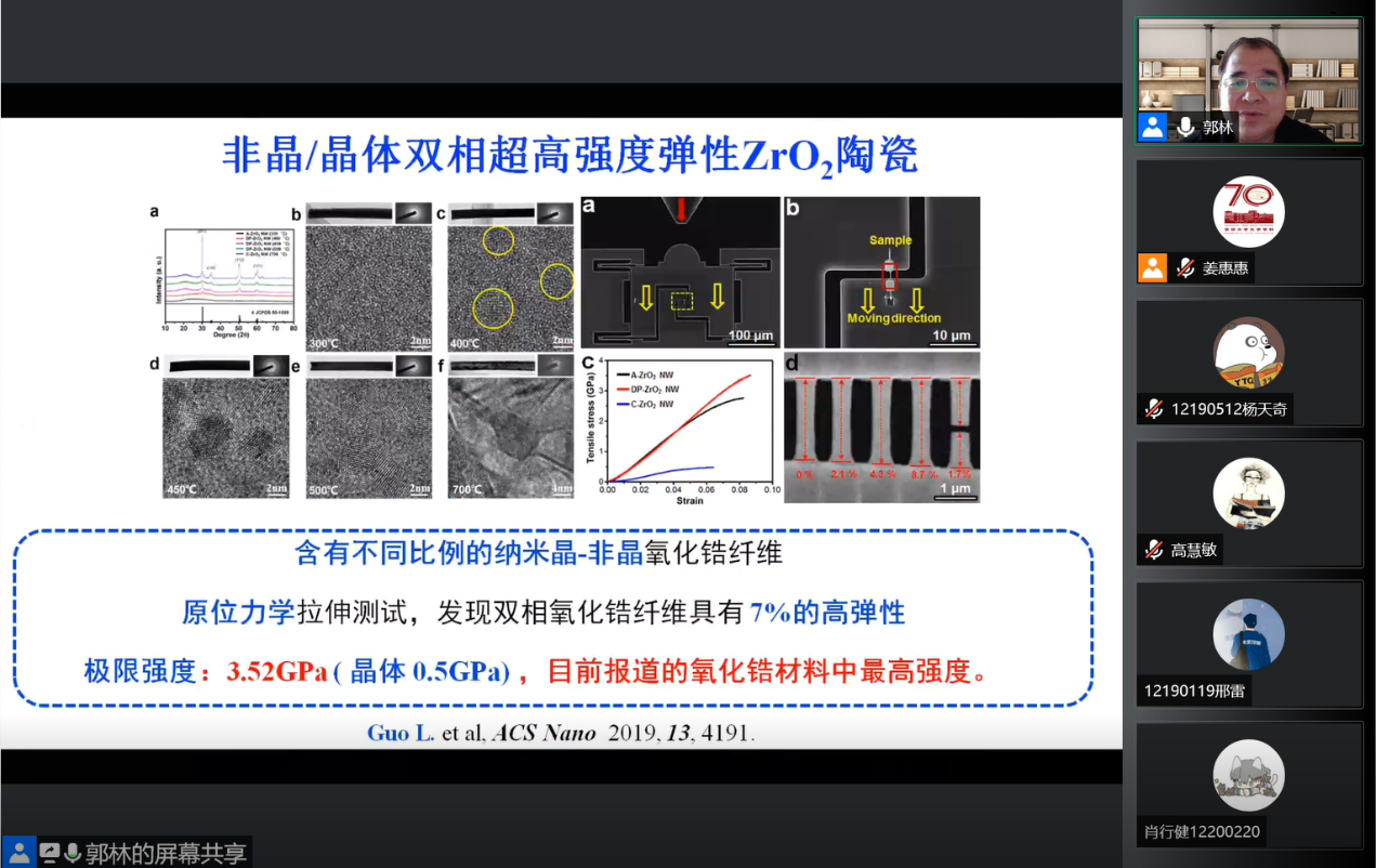 讲座中,郭林教授围绕无机非晶微纳米材料的可控合成及相关特性深入浅出地分享了其课题组在非晶微纳米材料普适制备方法,无机非晶微纳米材料光学特性、催化特性,非晶微纳米材料的力学特性及其在牙修复中的应用等方面的研究进展,展现了无机非晶微纳米材料的研究前沿及广阔的应用前景。在交流互动环节,郭林教授耐心详细地解答了院内外师生的问题,并对相关领域的发展出了展望。黄色视频