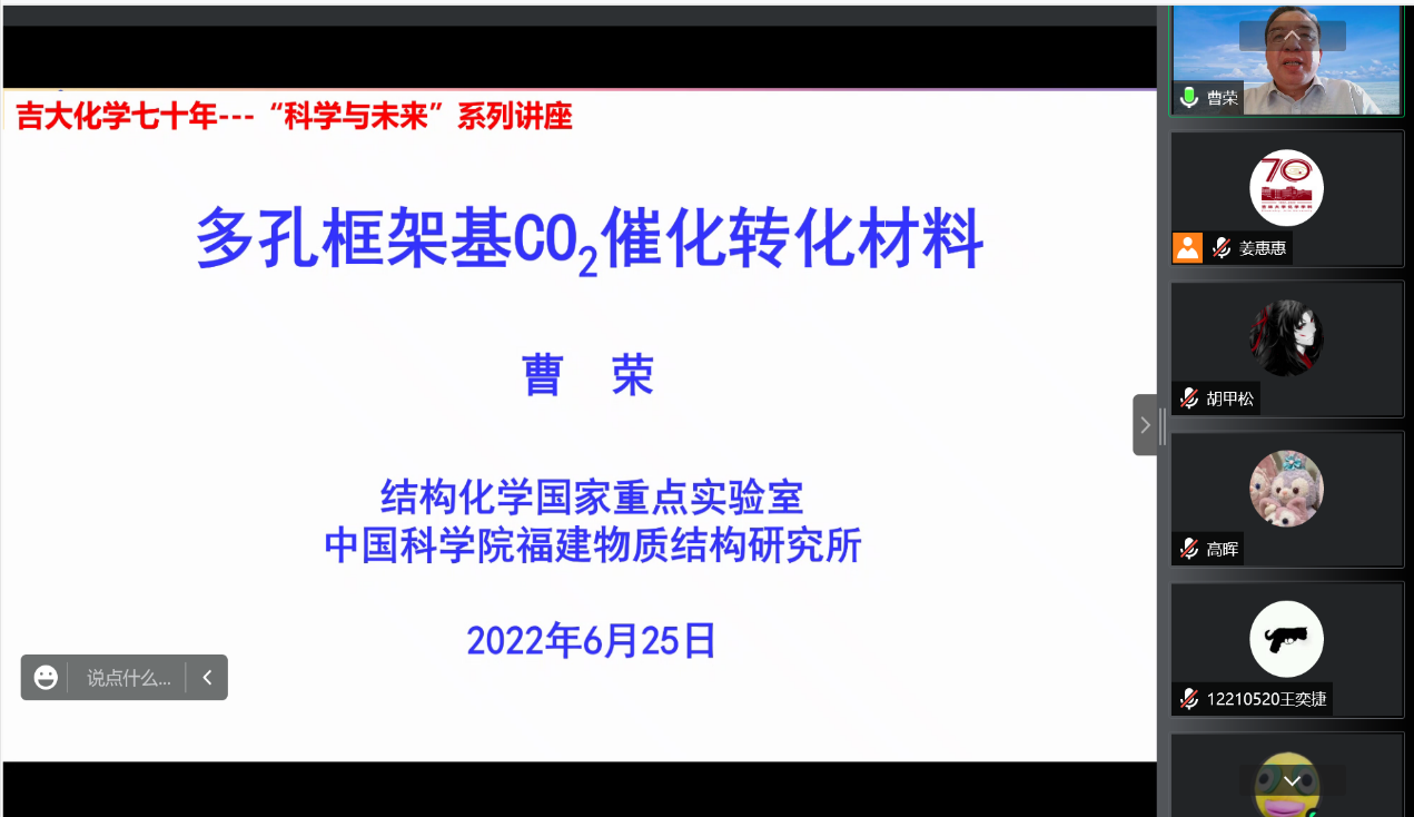 6月25日上午,中国科学院福建物质结构研究所研究员、国家杰出青年科学基金获得者曹荣应邀线上做客“吉大化学七十年——科学与未来系列讲座”,以“多孔框架基CO2催化转化材料”为题,为学院师生作学术报告。