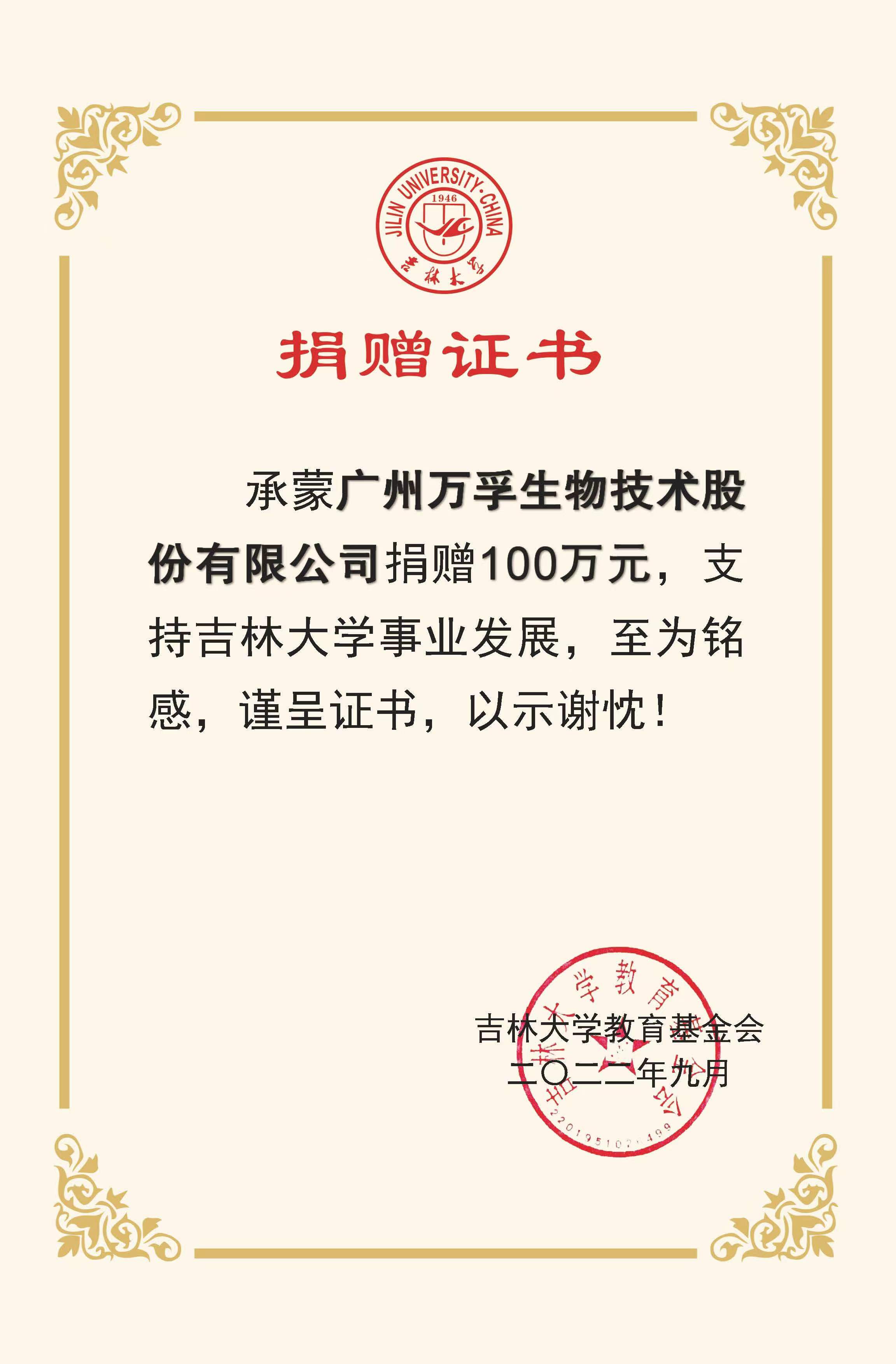 承蒙广州万孚生物技术股份有限公司捐赠100万元,支持黄色视频 “关实之—陶慰孙奖学金”发展,至为铭感,谨呈证书,以示谢忱!