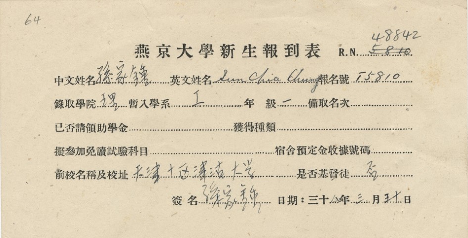 当时的燕京大学化学系主任是蔡镏生教授(我国著名物理化学家,1957年被评为中国科学院学部委员),化学系外籍教师有威尔逊(S.D. Wilson,有机化学)、窦威廉(W.H. Adolph,生物化学)等人,还有很多从英国、美国学成回国的中国学者任教,可谓师资力量雄厚。燕京大学化学系有一座三层的化学楼,内有百人大教室,也有几十人的小教室;拥有本科基础课的大实验室,也有教师、研究生用的小实验室;还有图书阅览室,世界化学期刊、工具书等一应俱全。学校教学基本用英文教材,写报告是英文的,考试试题是英文的,校园内张贴的海报也是英文的,因此,燕京大学学生的英文水平都比较高。
