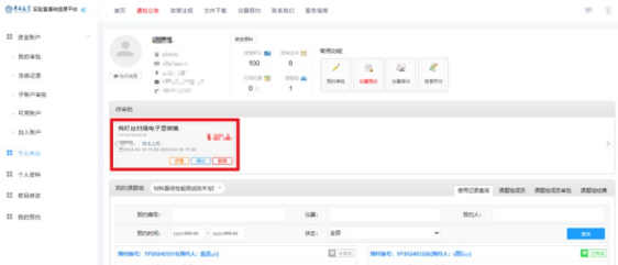 2. 点击“”仪器预约“”模块,进入页面后点击该页面中的“仪器预约”。