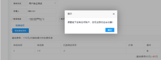 注意:基本信息中的导师信息填写时,如果导师没有申请自己的课题组并添加相应的付款项目,而在项目名称栏中手动填写项目名称,在点击立即提交后,会出现如下提示。因此,在预约测试前需要确认导师是否用本人账号完成课题组创建和相应的付款项目信息填写。(该部分流程见“校内课题组创建流程”文档)。
