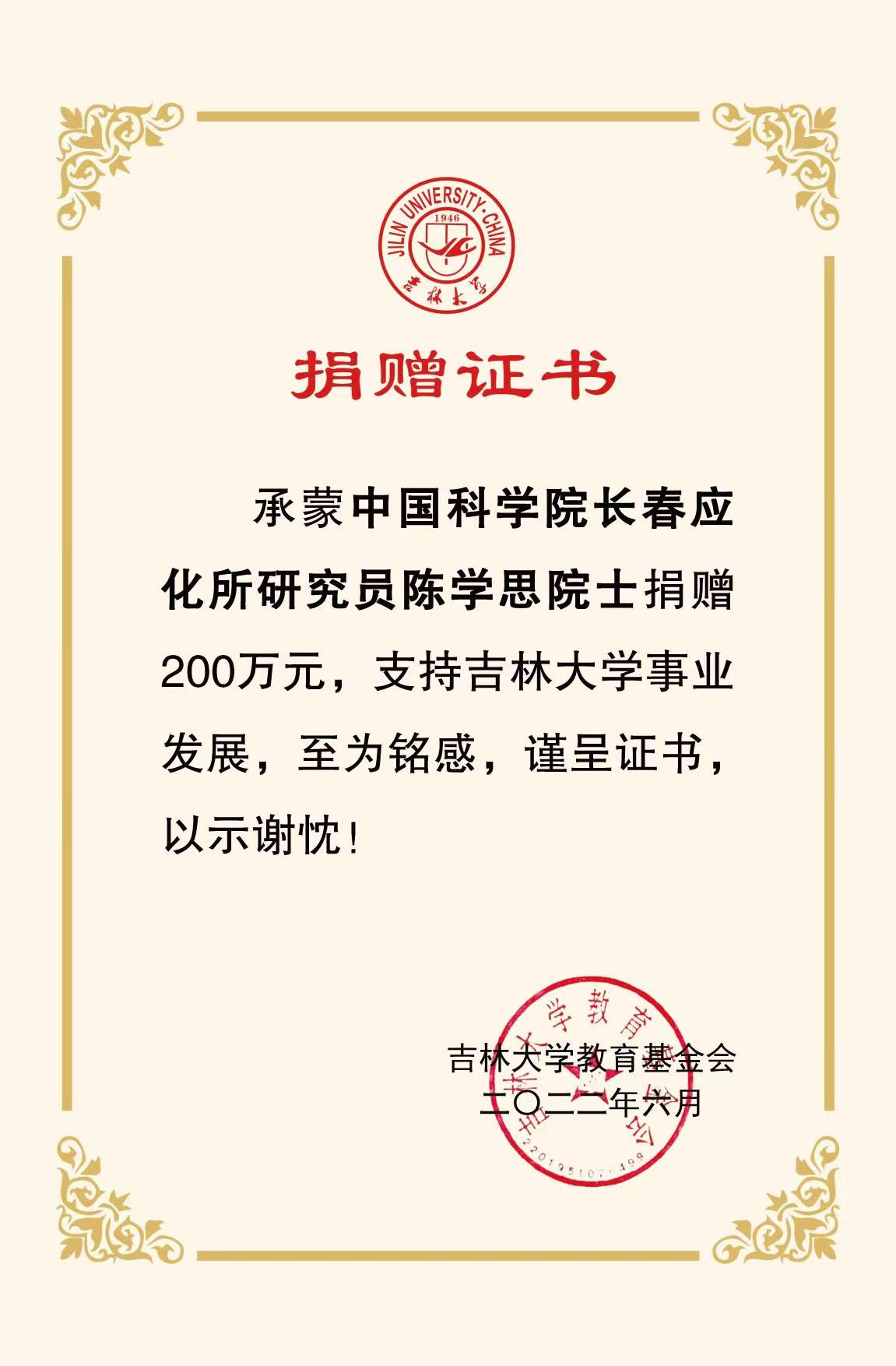 承蒙78级校友、中国科学院院士、中国科学院长春应用化学研究所陈学思研究员捐赠200万元,支持黄色视频 “关实之—陶慰孙奖学金”发展,至为铭感,谨呈证书,以示谢忱!